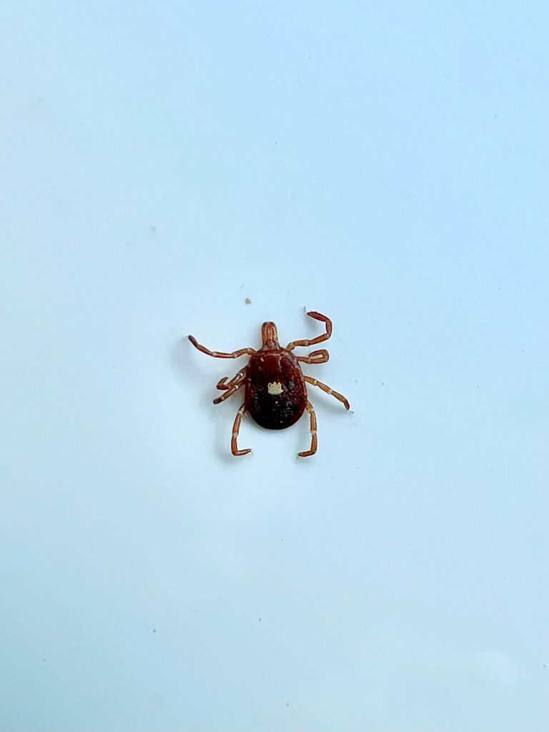 The Lehigh County Conservation District’s Vector Borne Disease Control program has collected their first Lone Star Tick (Amblyomma americanum) in Lehigh County. Pictured is the adult female tick with the distinctive white dot on its dorsal shield. Lone Star Ticks are known to transmit Ehrlichiosis, Rocky Mountain Spotted fever, Tularemia, and STARI. Bites from the Lone Star tick may also trigger a red meat allergy.
