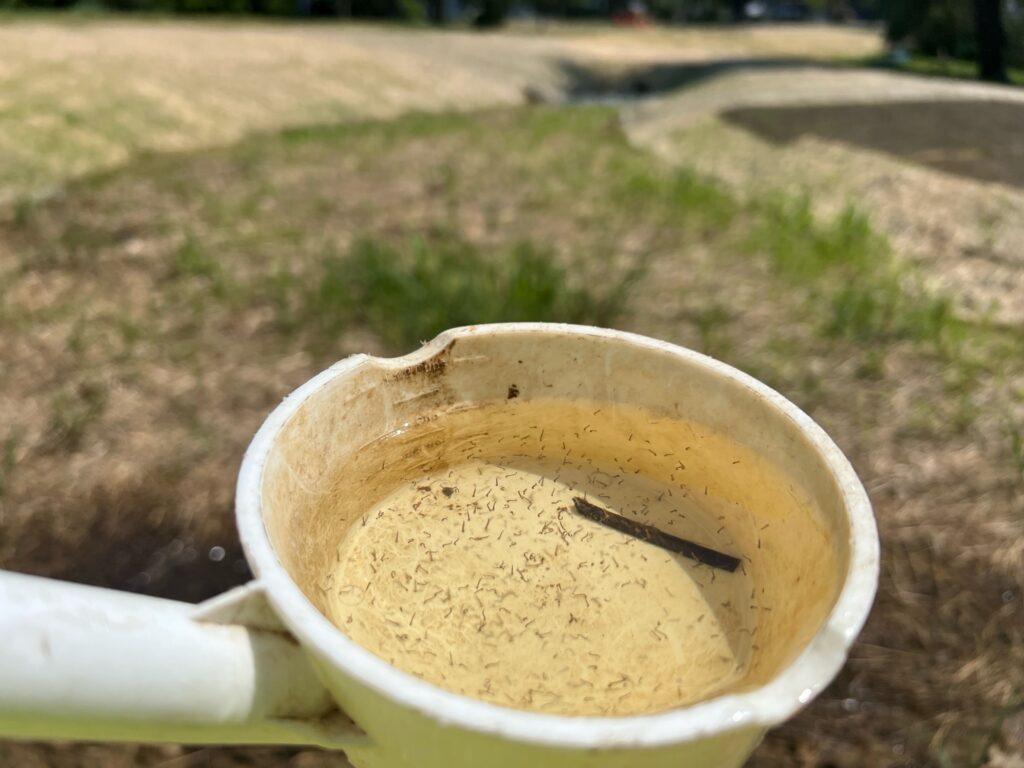 This newly constructed retention basin with a small depression of water is a great example of a mosquito breeding hotspot. Overly compacted basins don’t allow for water to drain very quickly, which in turn causes standing water. Check out the hundreds of mosquito larvae that came from just one scoop inside this puddle!